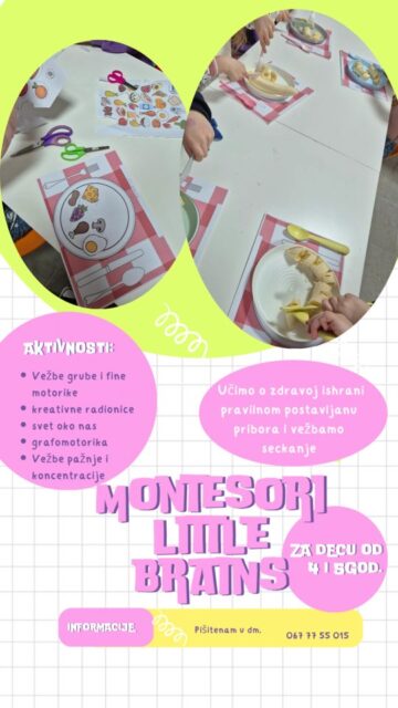 Priprema predškolaca zasnovana na principima Montessori pedagogije pružiće detetu osnove za dalje školovanje . Radimo na grafomotorici i motorici , početno čitanje i pisanje , brojevi , svet oko nas kao i poboljšavanje veština komunikacije i socijalizacije i izgradnja samopouzdanja. Deca koja pre polaska u školu savladaju bar osnovne veštine čitanja i pisanja sigurno lakše napreduju na putu svog obrazovanja i to se vidi već u prvom razredu.